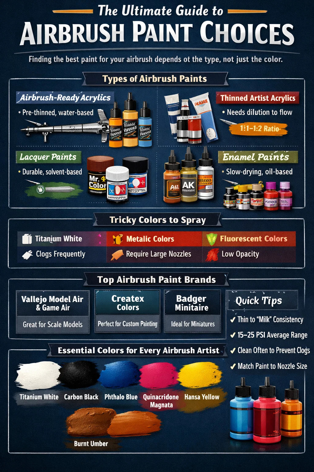 Color airbrush optimus est ille qui nitide fluit per tuam setup, tuo inhaeret superficiei, et effectum consequitur te post — Et alia responsio est pro omni artifice, omni consilio, et omni airbrush. Intellectus principia post magnitudinem pigmenti, viscositatem, et chemiam pingere te constituit in positione ad faciendum iudicium illud cum fiducia omni tempore.