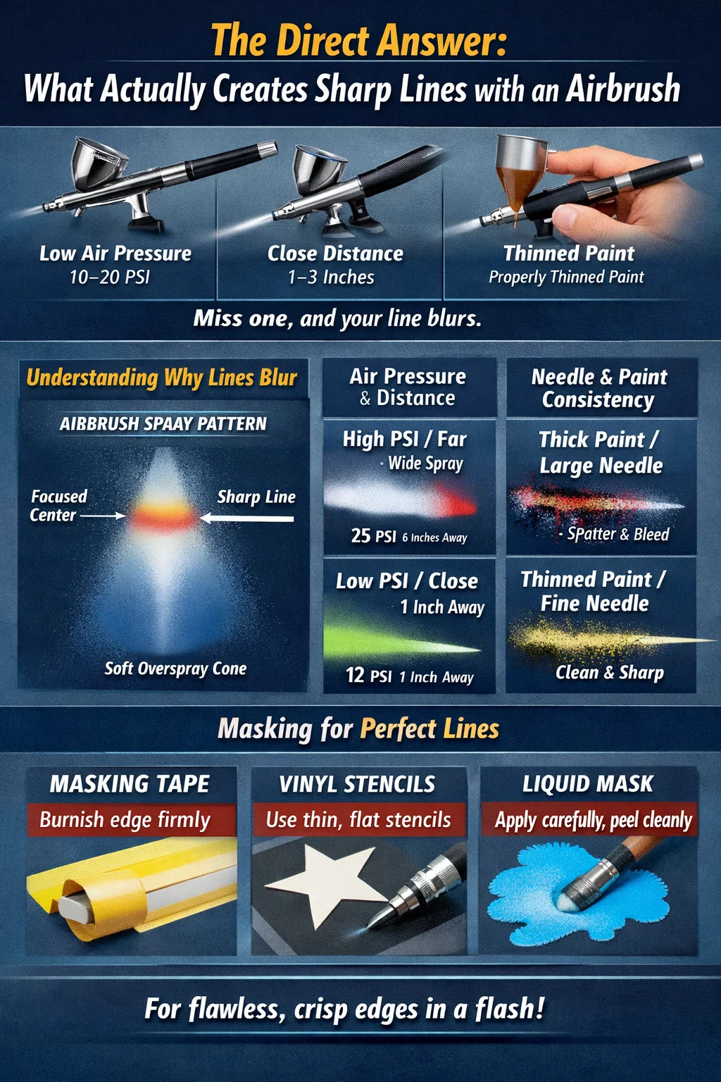 Acutae lineae cum airbrush descenderunt ad quatuor cori variabiles cooperantes; humilis aeris pressura (typice 10-20 PSI) , arcta operatio distantiae (1-3 pollices a superficie), extenuatum proprie pingere, et felis moderatio deliberata. Horum unum etiam requiro, et tua linea emollit, ceptores, vel respersos. Maxime incipientes pugnant quia nimis longe a superficie laborant et nimis pressione utuntur - duo habitus qui praecisionem statim occidunt.